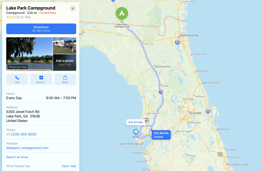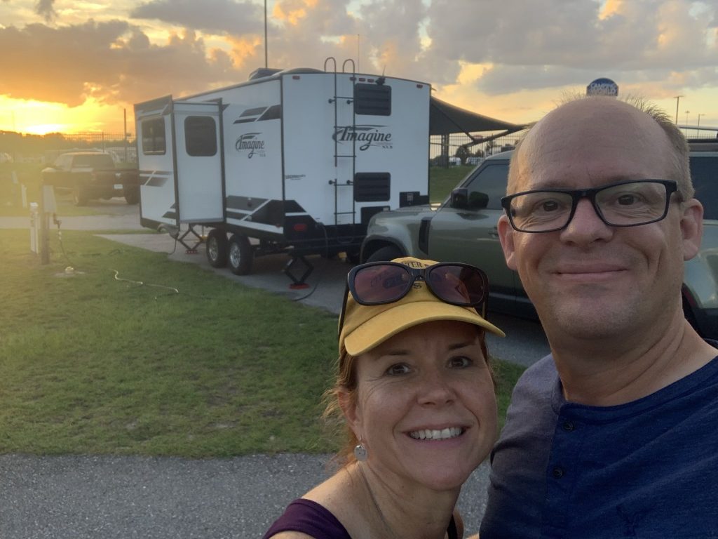 We made it out of Florida (barely). We knew it might be hard to get started, so our plan was to just get across the state line. We’ve had quite an ordeal getting a hitch that would fit with the spare tire on without hitting the power tongue jack on the trailer. We got a custom hitch installed in the morning, got the trailer packed up, and hit the road.