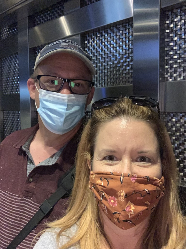 We sure don’t like wearing masks, or even like pictures in masks, but this is proof we were in that elevator to the top